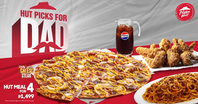 Throw dad a small yet satisfying pizza party with the HUT MEAL FOR 4 set, priced at P1,499. It comes with 1 Large Philly Cheesesteak Pizza (in your choice of either Pan Pizza or Mega Crunch Pizza), 1 Large Spaghetti Bolognese, 8 pieces of WingStreet Garlic Parmesan wings, and either 1 Pepsi Pitcher for dine-in orders or 1 Pepsi 1.5L for delivery.